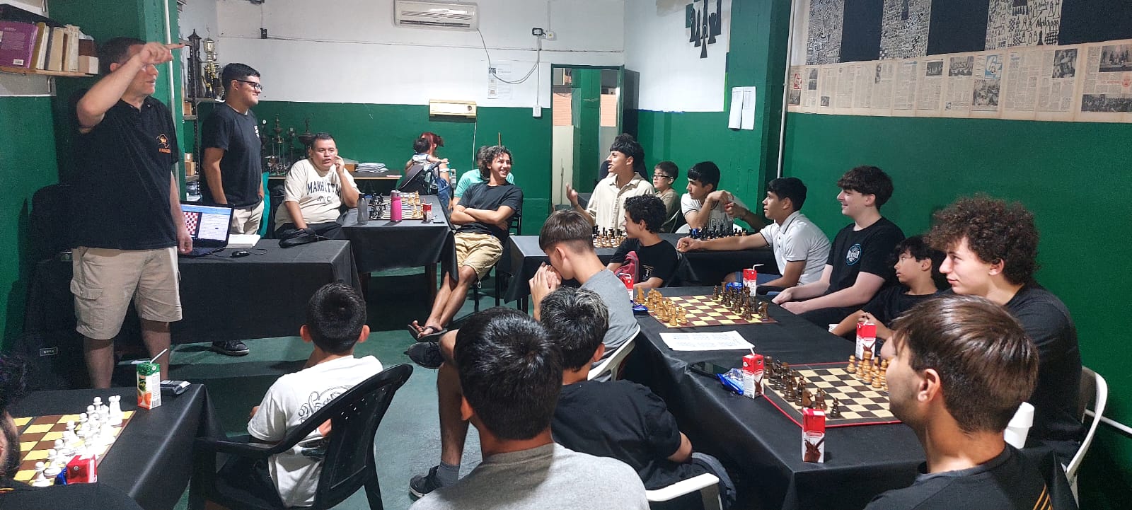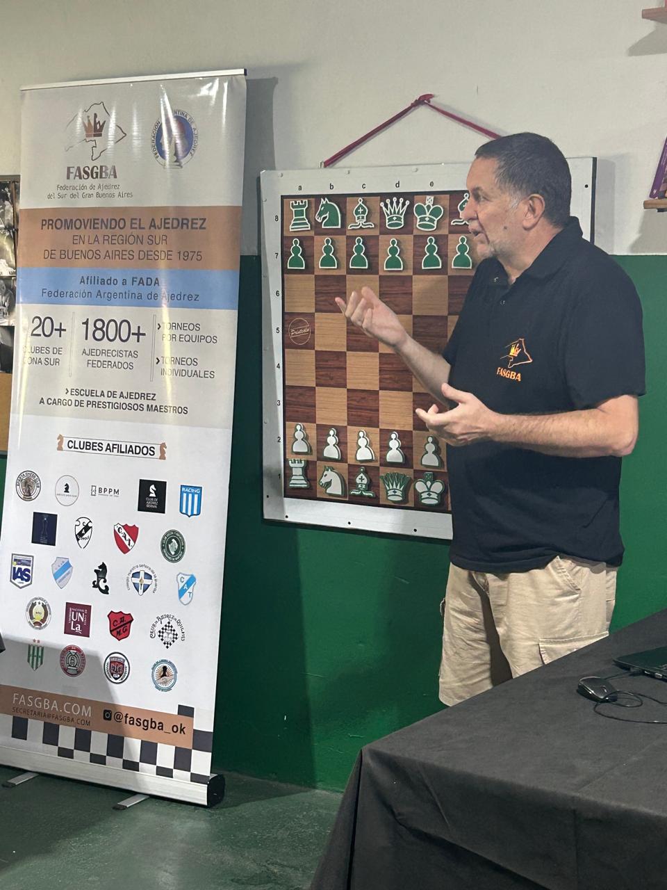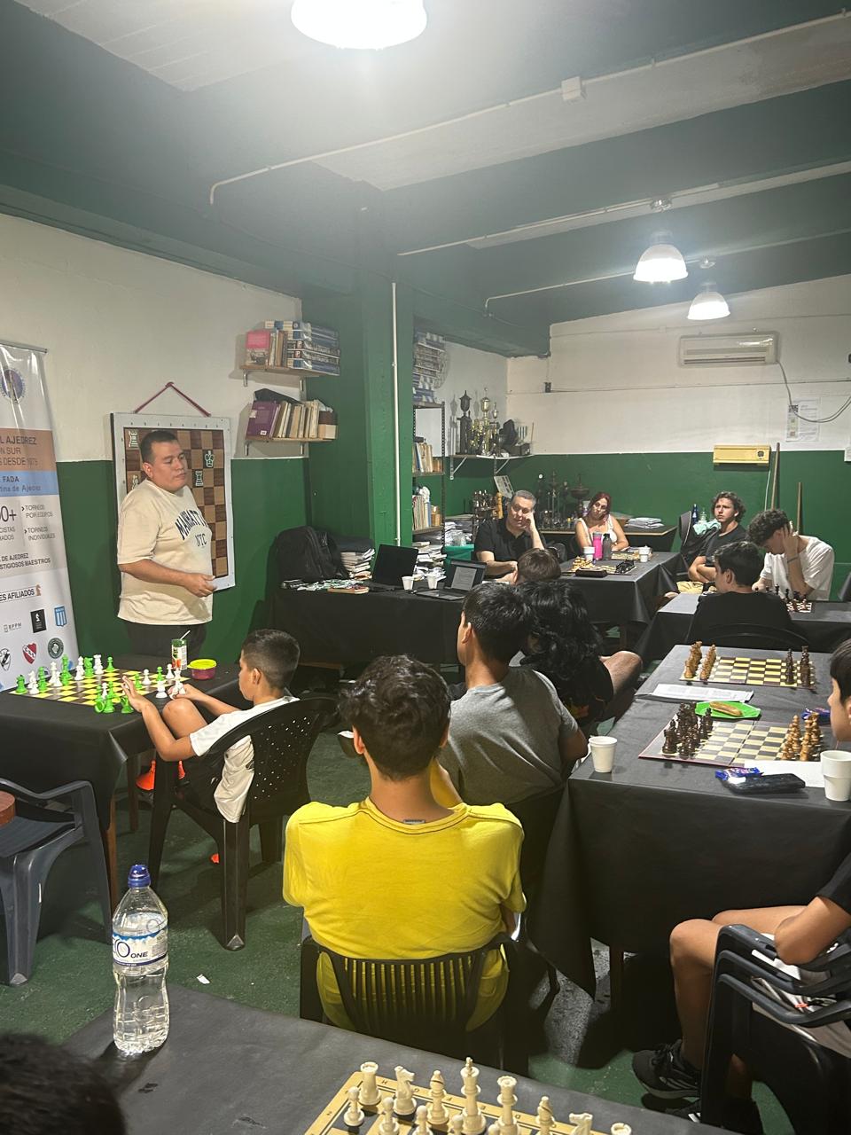 La actividad se dividió en 3 bloques temáticos: primero Gustavo utilizó una complejísima posición para generar un rico debate en torno al razonamiento y toma de decisiones ajedrecística, luego este servidor presentó 3 finales básicos de torre que los chicos no pueden dejar de conocer de cara a los CAM (posición Philidor, puente de Lucena y posición Vancura) y que sirvieron como preludio a la Escuela de la Federación próxima a iniciar actividades formales y finalmente cerró Darío Durán con una charla de aspectos reglamentarios que cautivó a la juvenil audiencia.