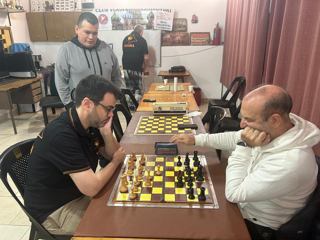 Su presidente Daniel Kountarás abrió las puertas de Bernal e invitó el café y medialunas. El escenario ideal para que un compacto grupo de ajedrecistas disfrutara la espléndida clase de Sebastián y se regocijara con las complejidades del ajedrez en un encuentro especial enfocado en finales de peones.
